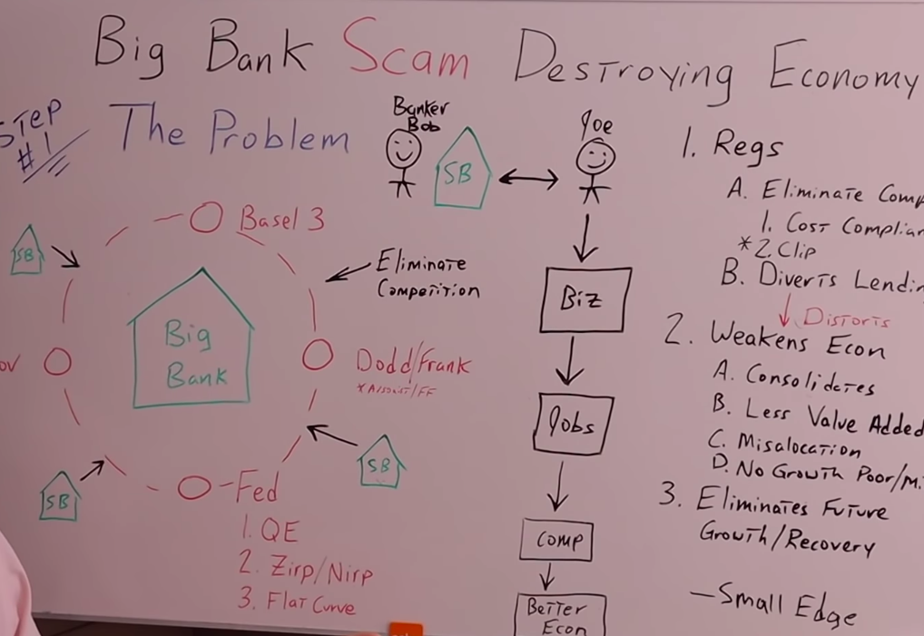 Take a look at this illustration of what's going on. Small banks, which are the growth engine of our economy are being eliminated. There's a barrier that's been built around the big banks that eliminates competition.
